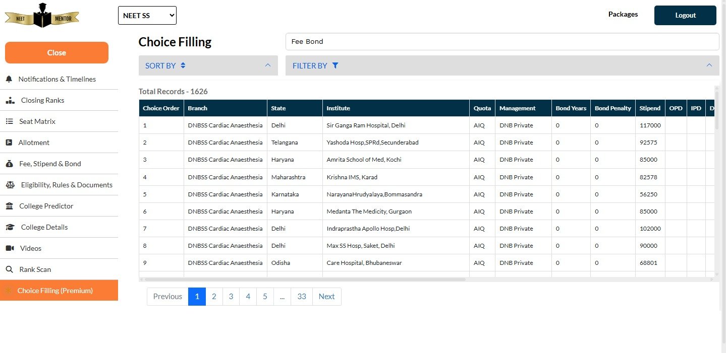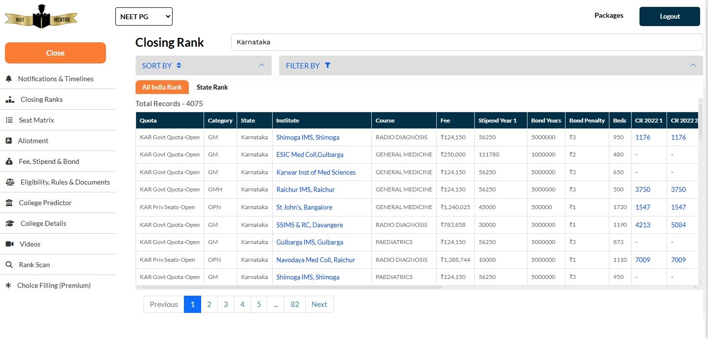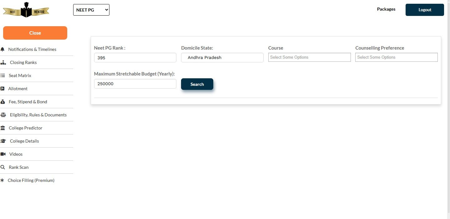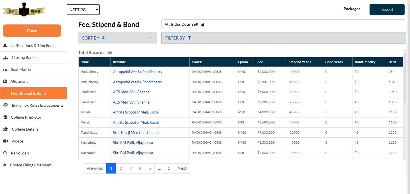 A: You can Use NEET MENTOR College Prediction Tools to find about College Possibilities Based on Your Rank, Category & State. And You can Contact NEET PG Expert who can Explain about the Possibilities based on Your Rank. Where can a NEET PG Aspirants Find the Recent Details on NEET PG Colleges Review Bond, Stipend, Previous Year Cutoff, Tuition Fees, Seat Leaving Penalty details? NEET PREDICTOR Platform do have all Updated Data related to BONS Status of each and every State, Previous Year Category & Course Wise Closing Rank data, Institute & Courses wise Stipend Details, Recent Year Tuition Fees.